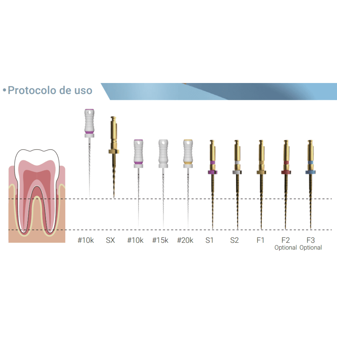Las limas rotatorias s eighteeth tienen 3 limas de formación para una formación profunda y 3 limas de acabado para pasar curvas desafiantes en la región apical.